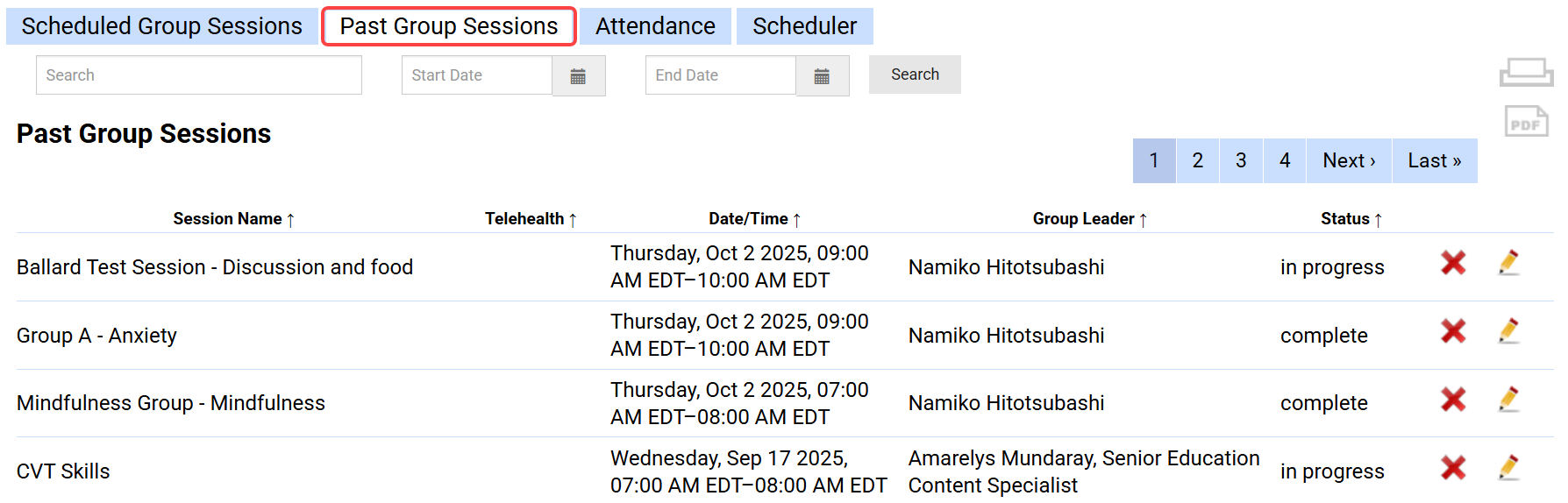 Past Group Sessions: This tab allows users to view all existing group sessions in In Progress, Pending Review, or Completed statuses.