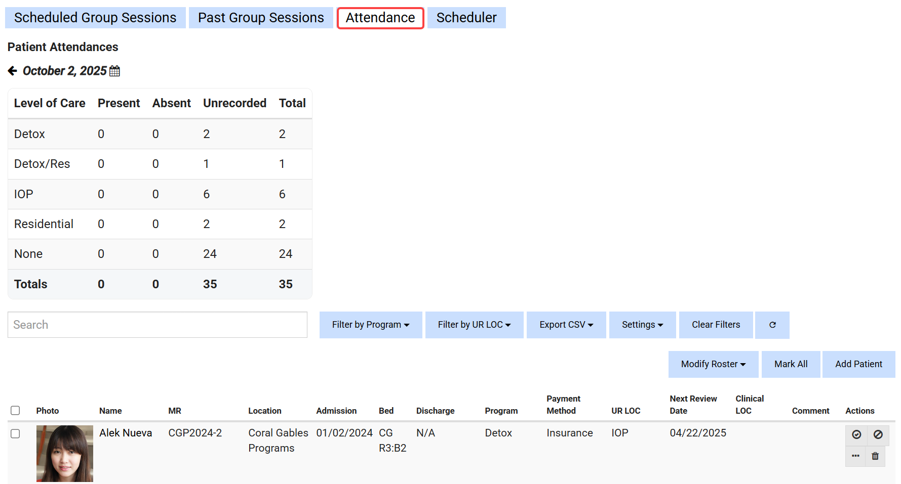 Attendance: This tab allows users to track patient attendance and absences.