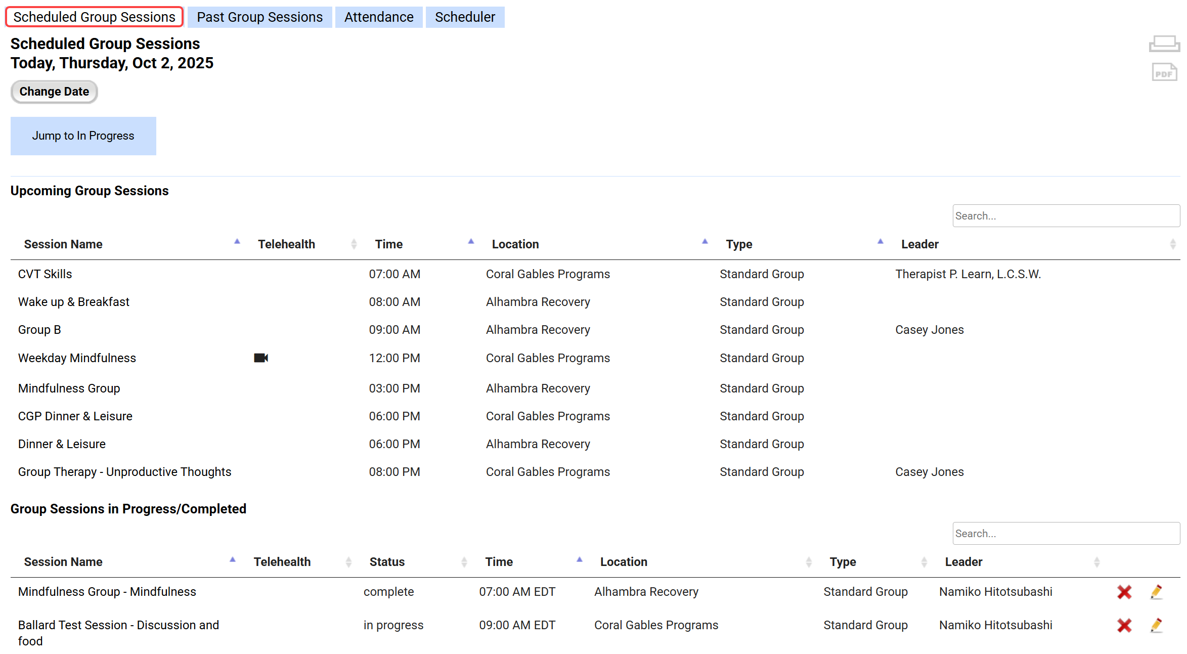 Scheduled Group Sessions: This tab allows your therapists (or other staff members with appropriate permissions) to view today's scheduled sessions and document their group notes.