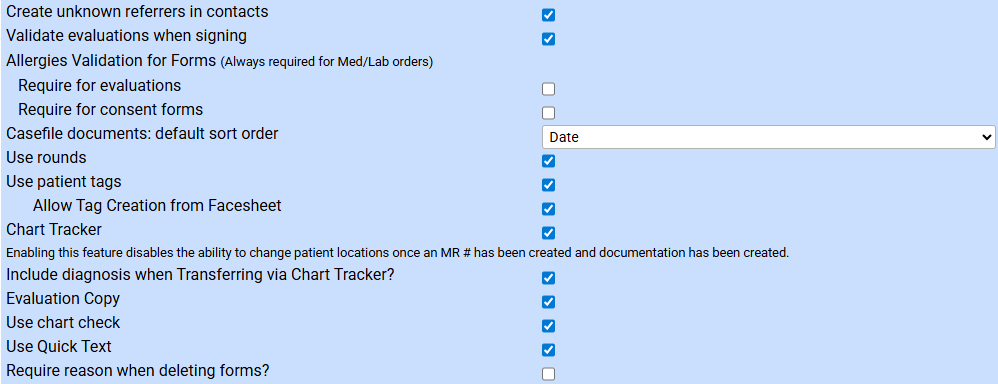 - Chart Tracker: Enable this feature to manage readmits, transfers, and transfer live forms.