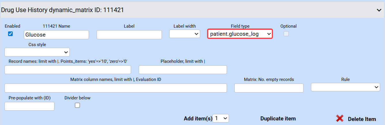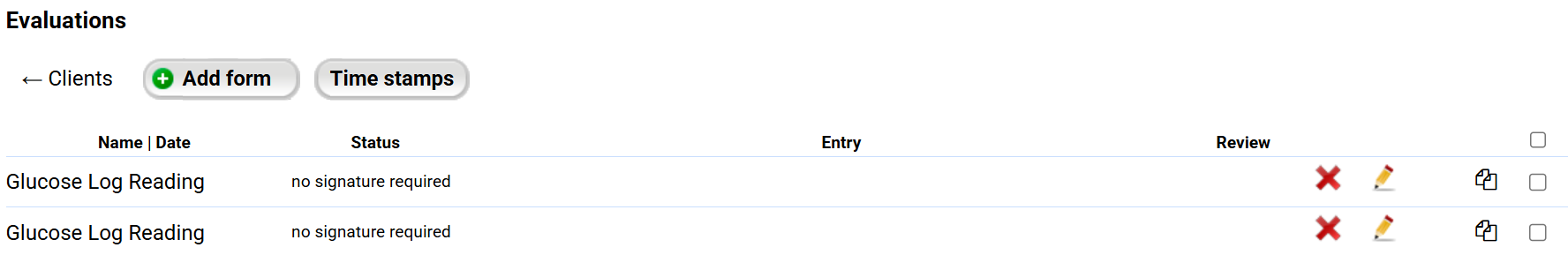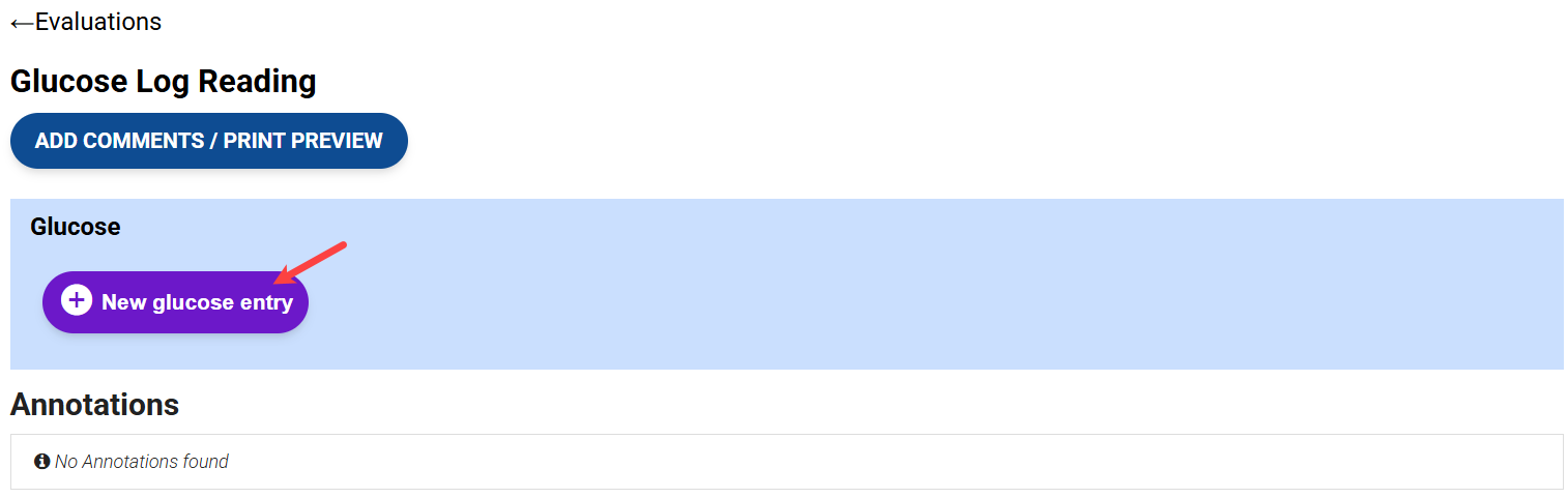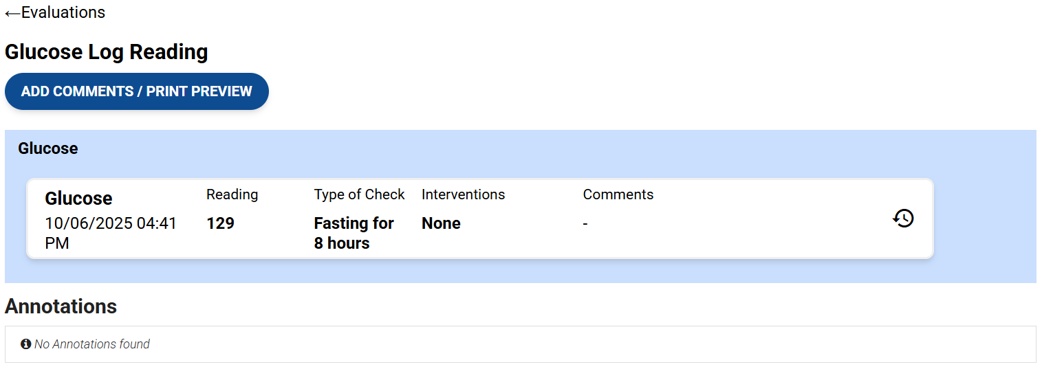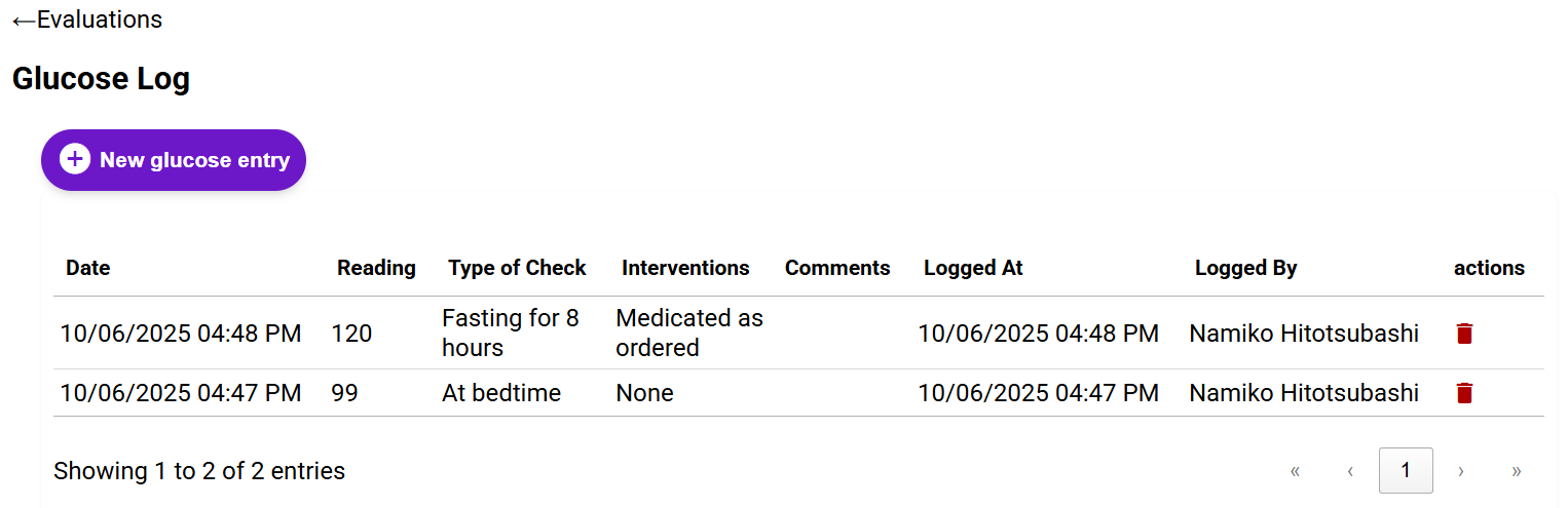 Depending on how you configure your evaluation form with the Glucose field, you can document a running log of all glucose readings in a single form, or you can add a single glucose reading for each form.