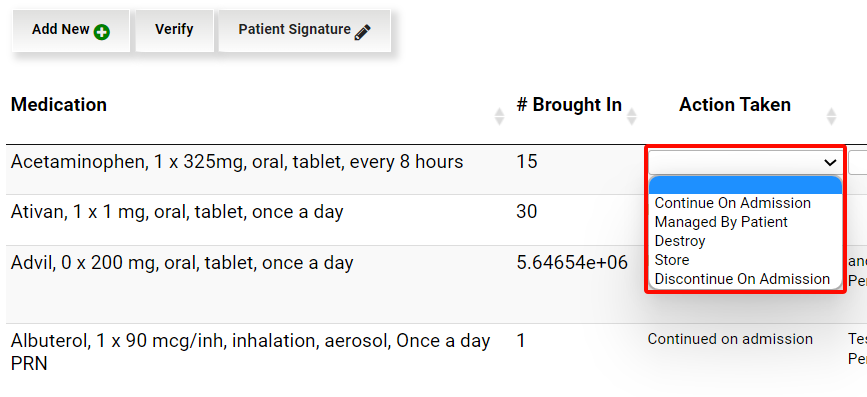 - From the Action Taken drop-down select an action for each medication you want to verify at this time.