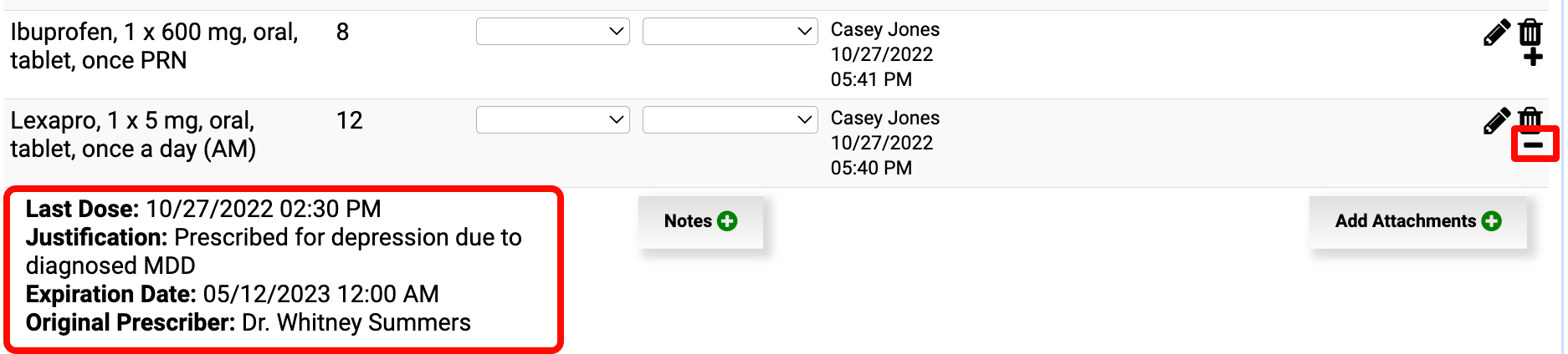 - After the medication is added, you can click on + and - icons to expand or collapse the medication details, notes, and attachments.