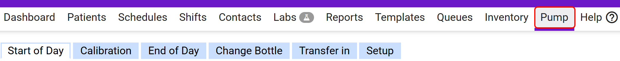 The MAT Pump tab is designed to make it easy to manage the daily pump processes, start of day, calibrate, change liquid medication, transfer, end of day, and maintain optimal pump performance.