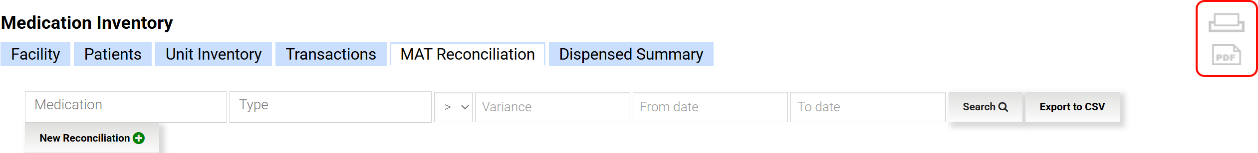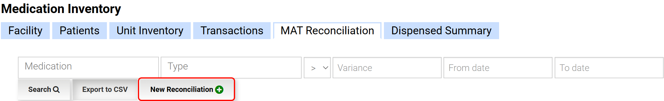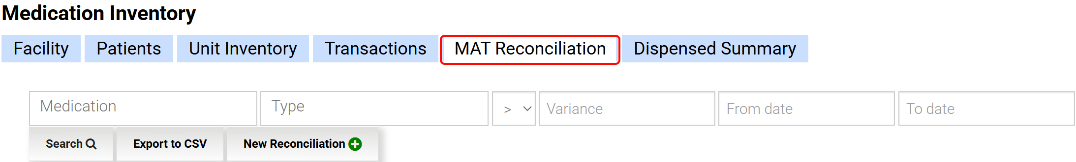 Existing MAT Reconciliations can be viewed by Medication, Type, Variance Amount, and From/To Date. The list can be exported to a CSV file and used to track trending variance over time.
