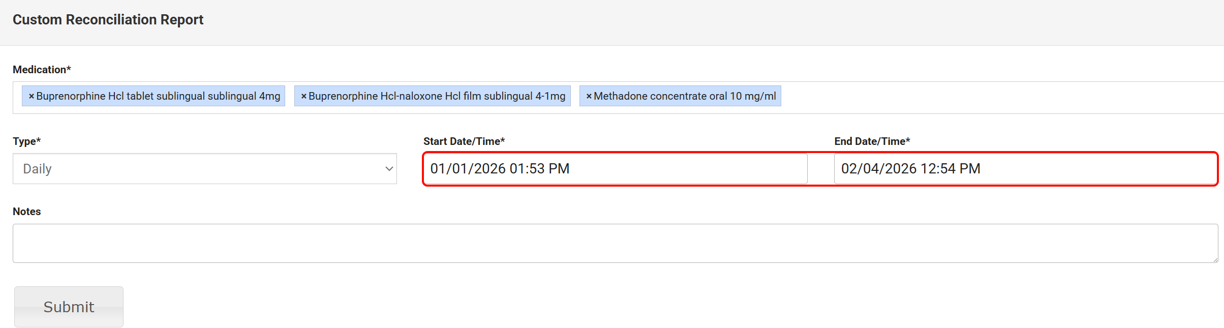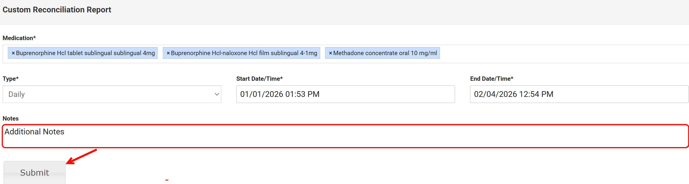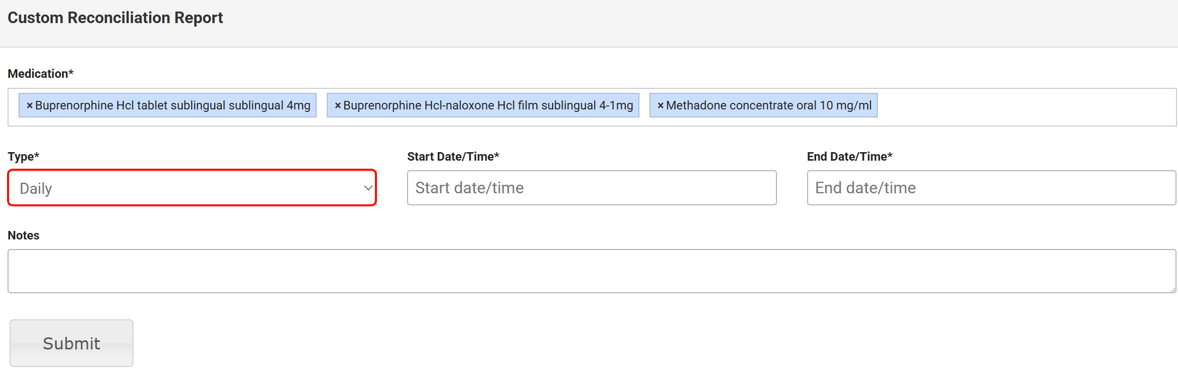 From the Custom Reconciliation Report window, select one or more Medications that you want to reconcile. The Medication field is now a multi-select dropdown that allows selecting multiple medications at once. A Select All option is included.
