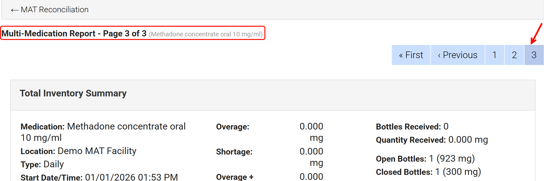 Select the remaining page numbers to review the other medications included in the report. In this example, page 3 of 3 displays Methadone concentrate oral 10 mg/ml.