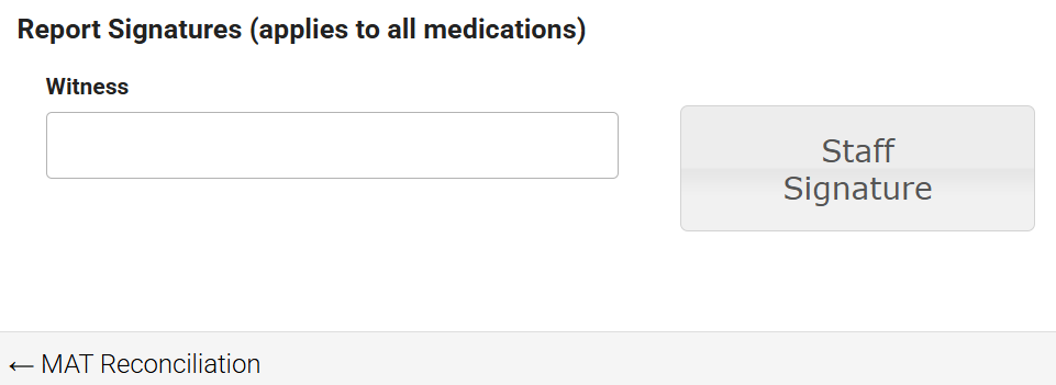 To complete the MAT Reconciliation report, sign at the bottom of the page. The report uses a single signature and witness field for the entire multi-medication report, rather than requiring separate signatures for each page. The signature applies to all medications included in the report. If the report is not signed, it remains in a Pending status. While the report is Pending, it can still be updated or deleted.