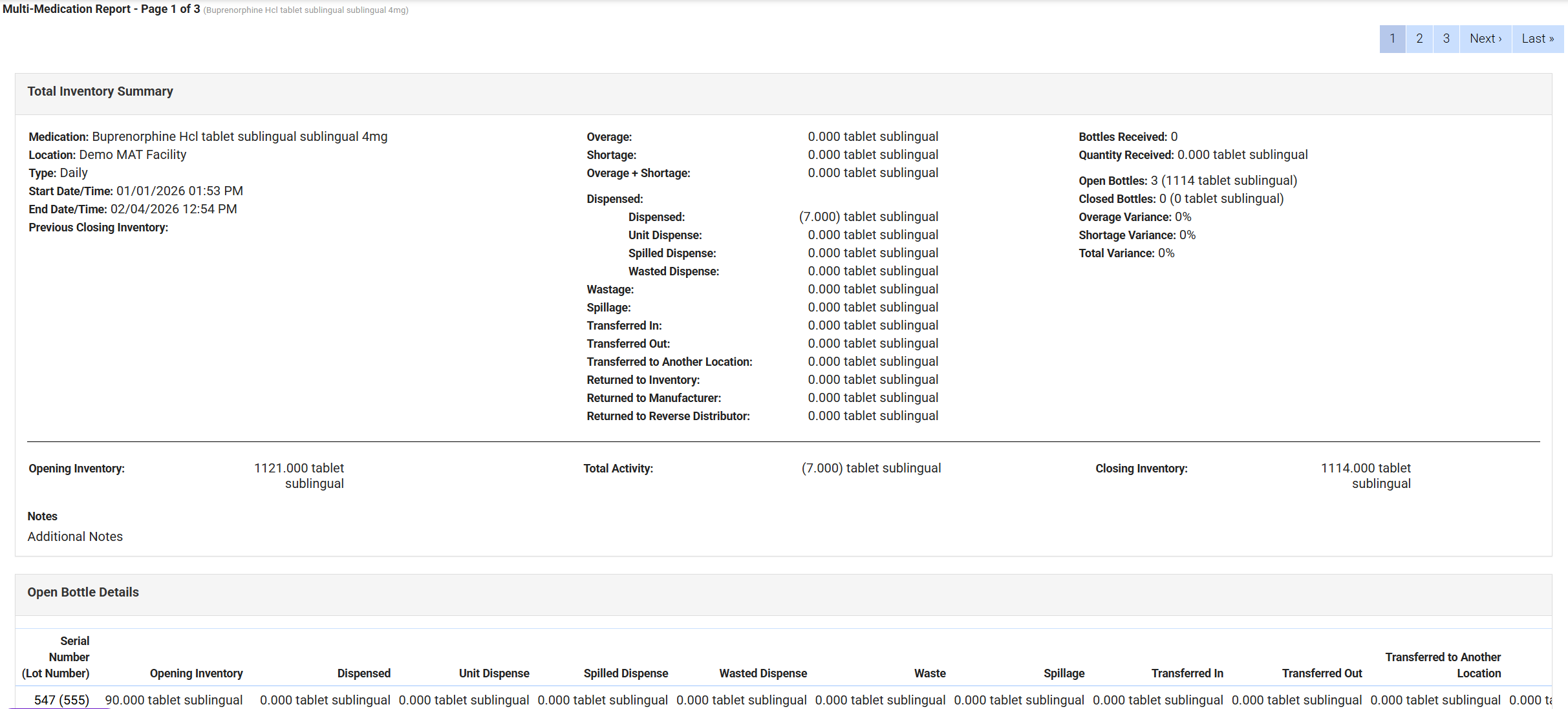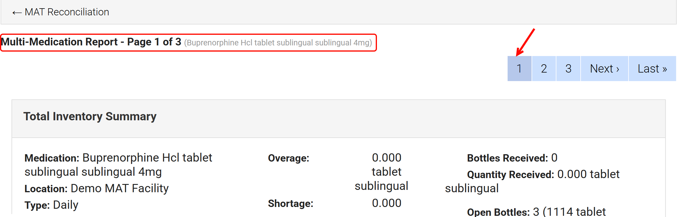 - Select a page number in the pagination control to view the report for an individual medication. In this example, page 1 of 3 displays Buprenorphine Hcl tablet sublingual 4 mg.