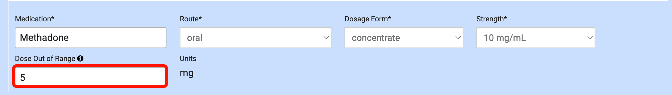 • Dose Out of Range: This field defines the threshold for triggering alerts when there is a significant change in the dosage of a patient’s MAT order. When creating or modifying a MAT order, the system will compare the dosage of the new order with the previous one. If the difference between the two doses is equal to or exceeds the value set in the Dose Out of Range field here, an alert will be triggered when you attempt to save the new order. The alert applies to all medications of the same type, even if they are from different manufacturers.