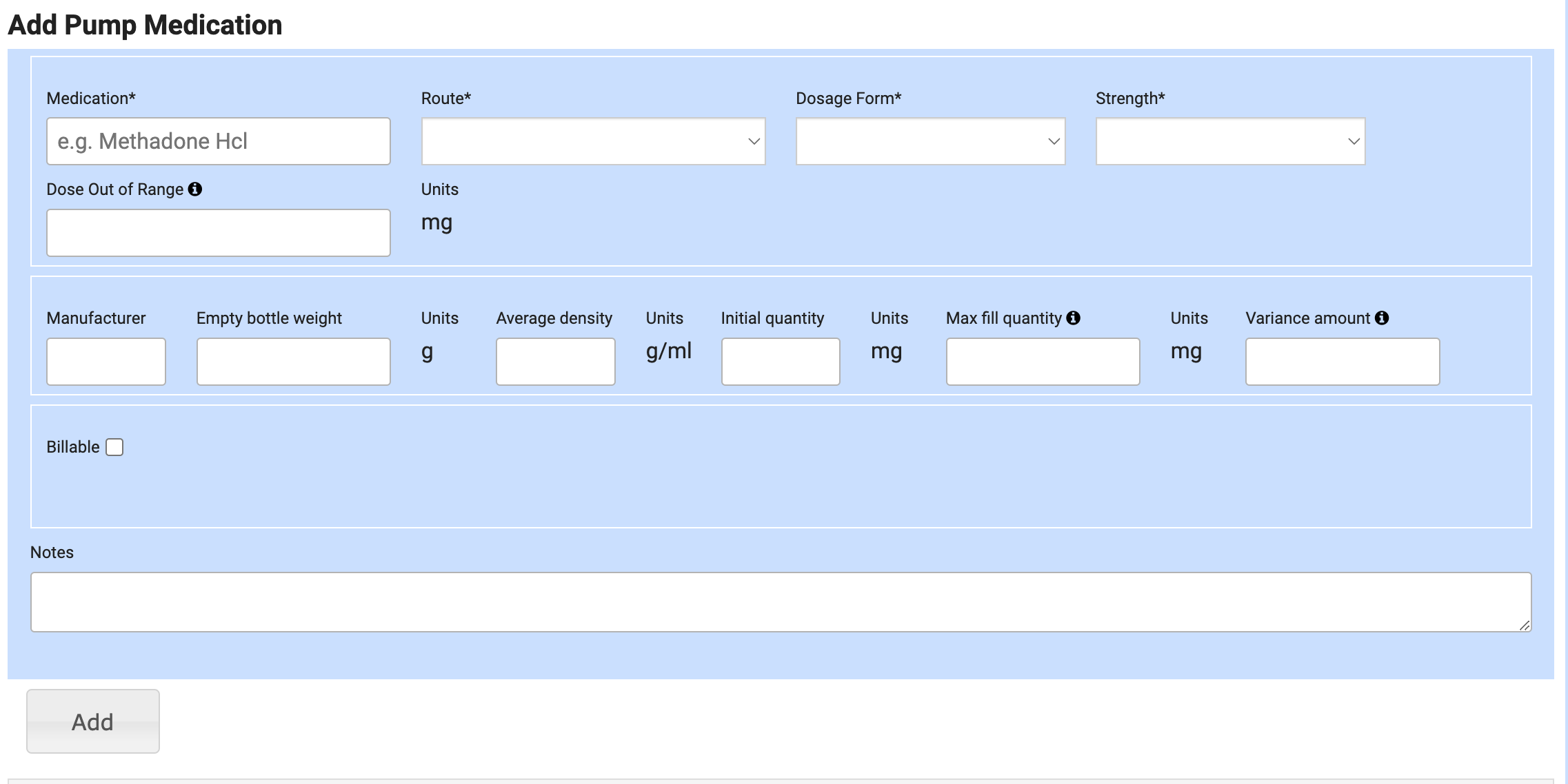 This section allows you to configure the liquid MAT medications dispensed through a pump.