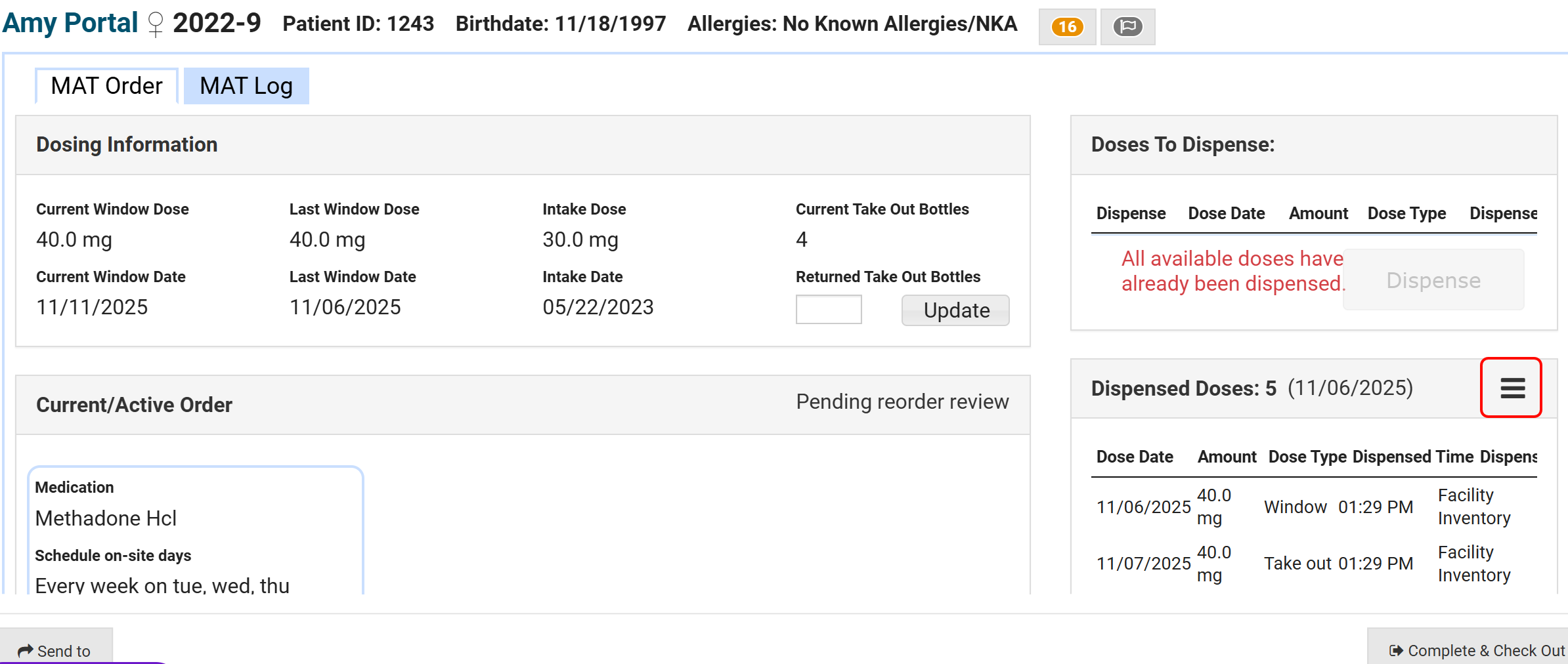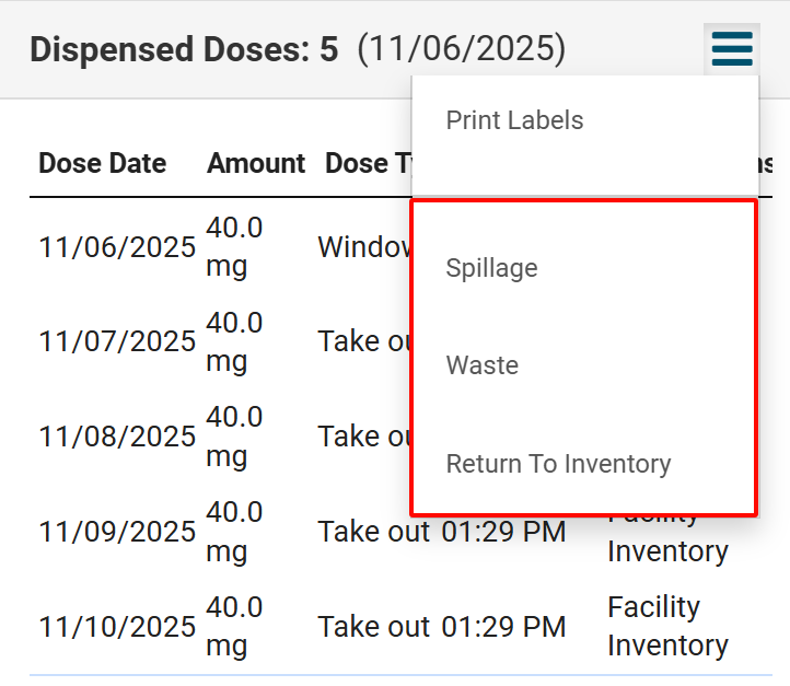 - Click on the Menu icon in the Dispensed Doses section.