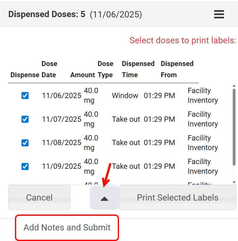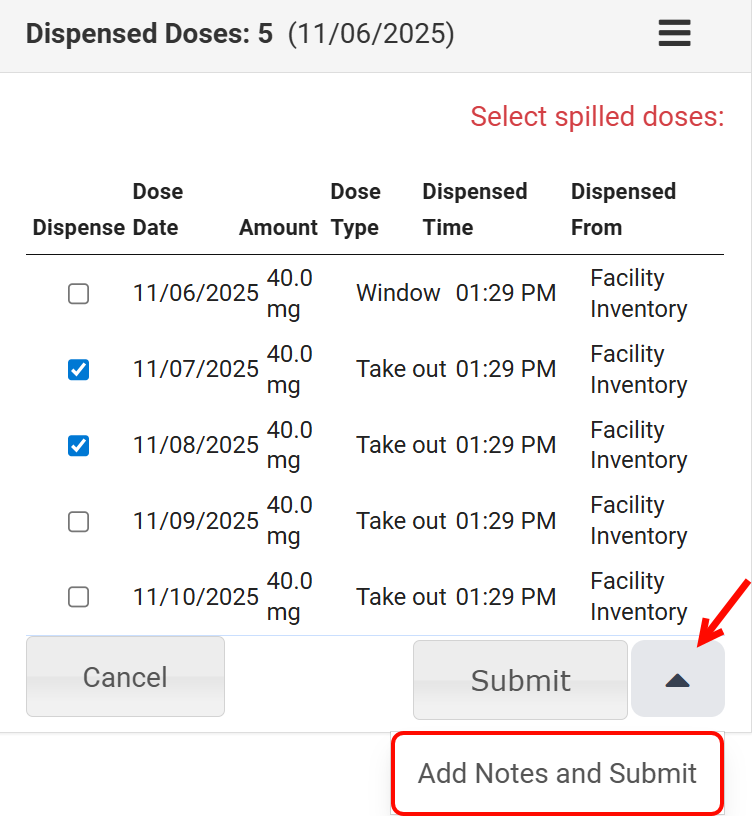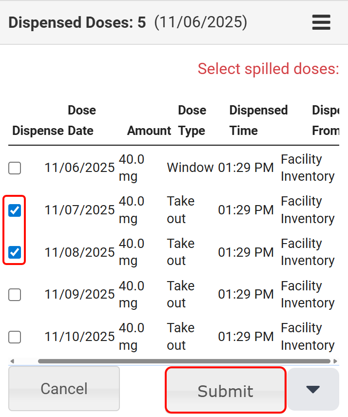 - Once the reason is selected, use the checkboxes to choose the doses to re-dispense and click Submit.