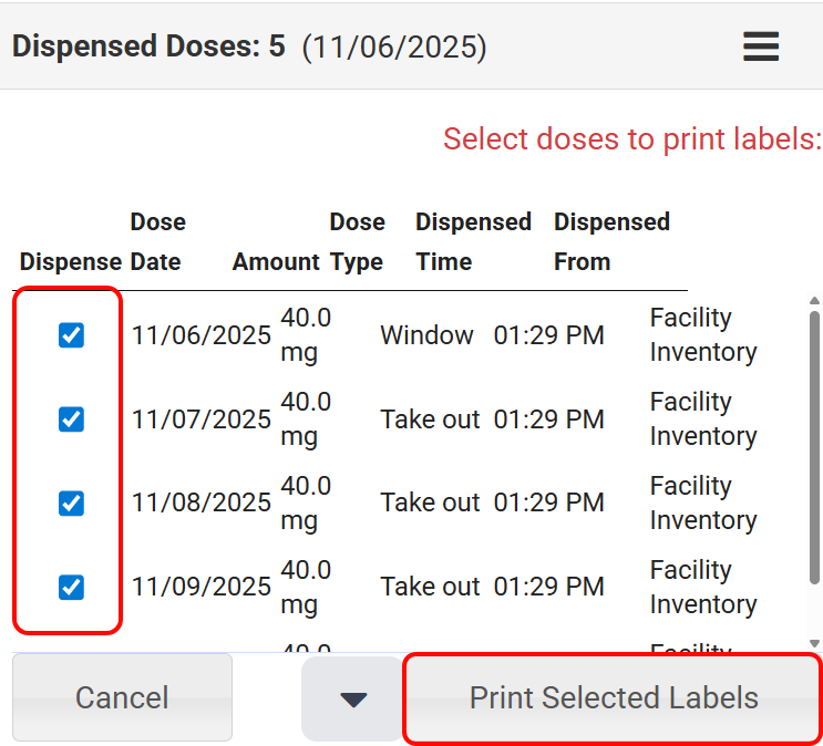 Select the checkboxes next to the doses you want to print and click on the Print Selected Labels button.