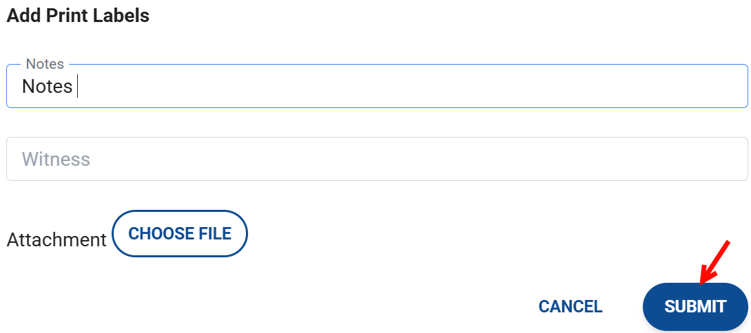 - If you need to add a witness, notes, or any attachments, click on the arrow next to the Submit button.