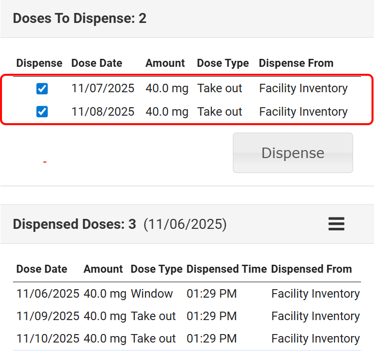 - Once a staff member signs, the dose will be available to re-dispense from the Doses to Dispense section.
