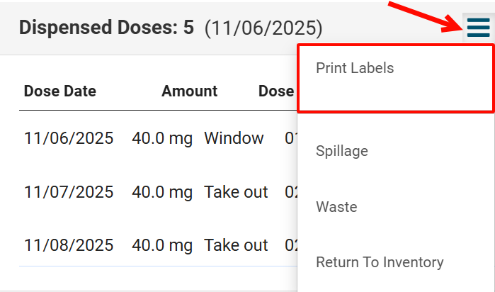 - Click on the Menu icon in the Dispensed Doses section and choose Print Labels.
