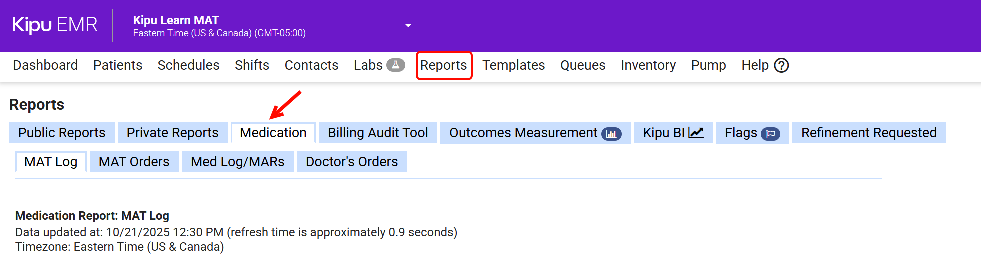 - To run the report, click on the Reports tab and select the Medication tab.
