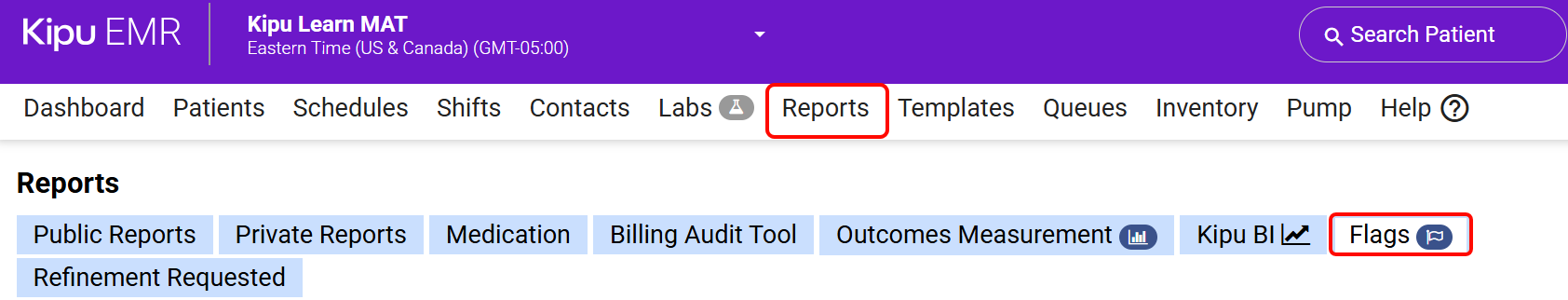 - To begin, click on the Reports tab in the header. Next, click on the Flags tab. You can review a list of existing patients who have flags assigned in this section.