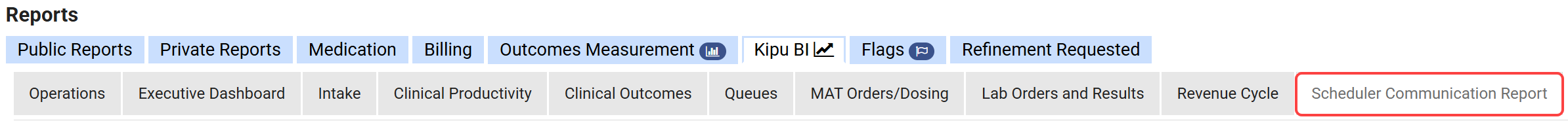- To reach the Kipu BI tab, click on the Reports tab, then Kipu BI.