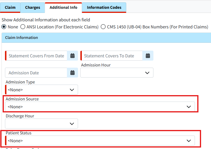 Under Claim Information, select the appropriate Admission Type and Patient Status from the drop-down menus.