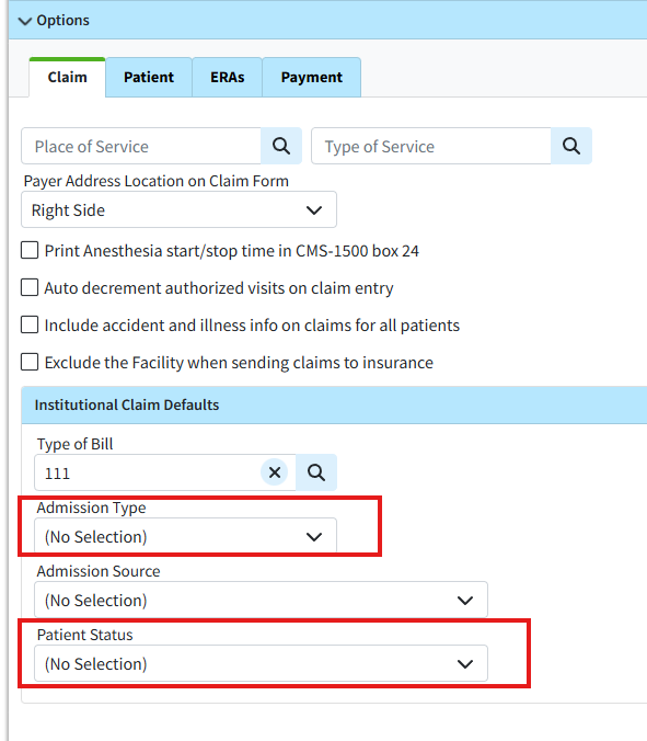 Under Institutional Defaults, choose the right values for Admission Type and Patient Status from the drop-down menus.