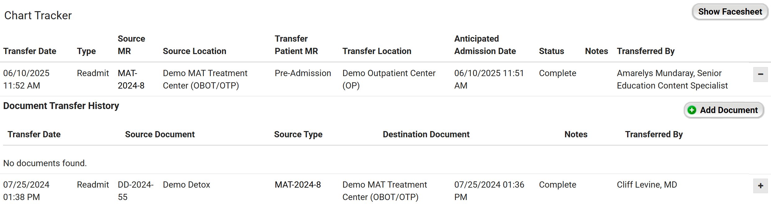 - The transfer process will also create a link between the episodes of care that allows users with the Manage Chart Transfer feature (and super admins/records admins) to transfer live forms from the previous chart to the new chart at any time.
