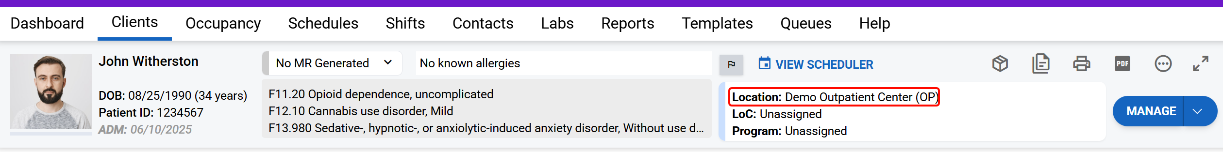 Click on the Manage arrow to complete the Treatment Episodes: Admission workflow.