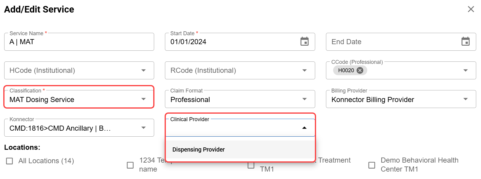 Billing: MAT Billing customers in Arizona can now send the box 19 dispensing clinical provider on dosing services when MAT Dosing Service is set as the classification and Dispensing Provider is chosen as the clinical provider in Settings > Billing > Services. For more information, check out the MAT Dosing Service section of this article.