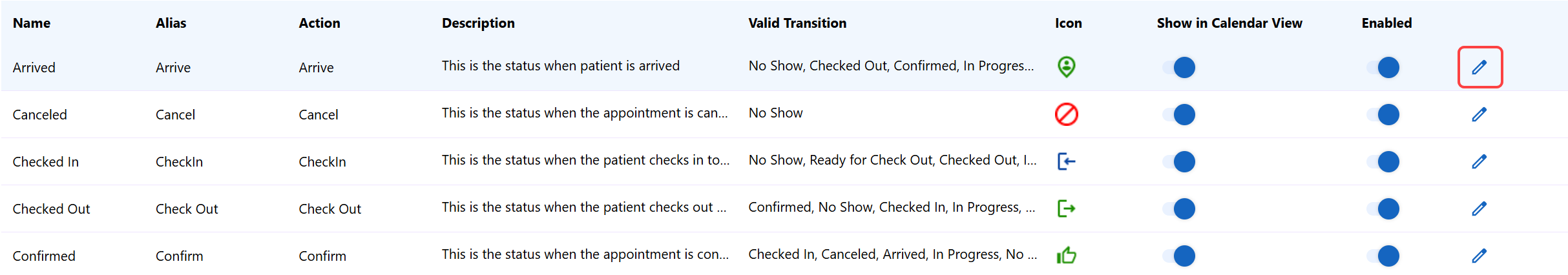 Appointment Status Settings UI Modernization: As part of modernizing the Scheduler code and UI, we have updated the Appointment Status Settings screen. The main change users will see is that the edit action icon will now persist on each row. For more information on appointment statuses click here.