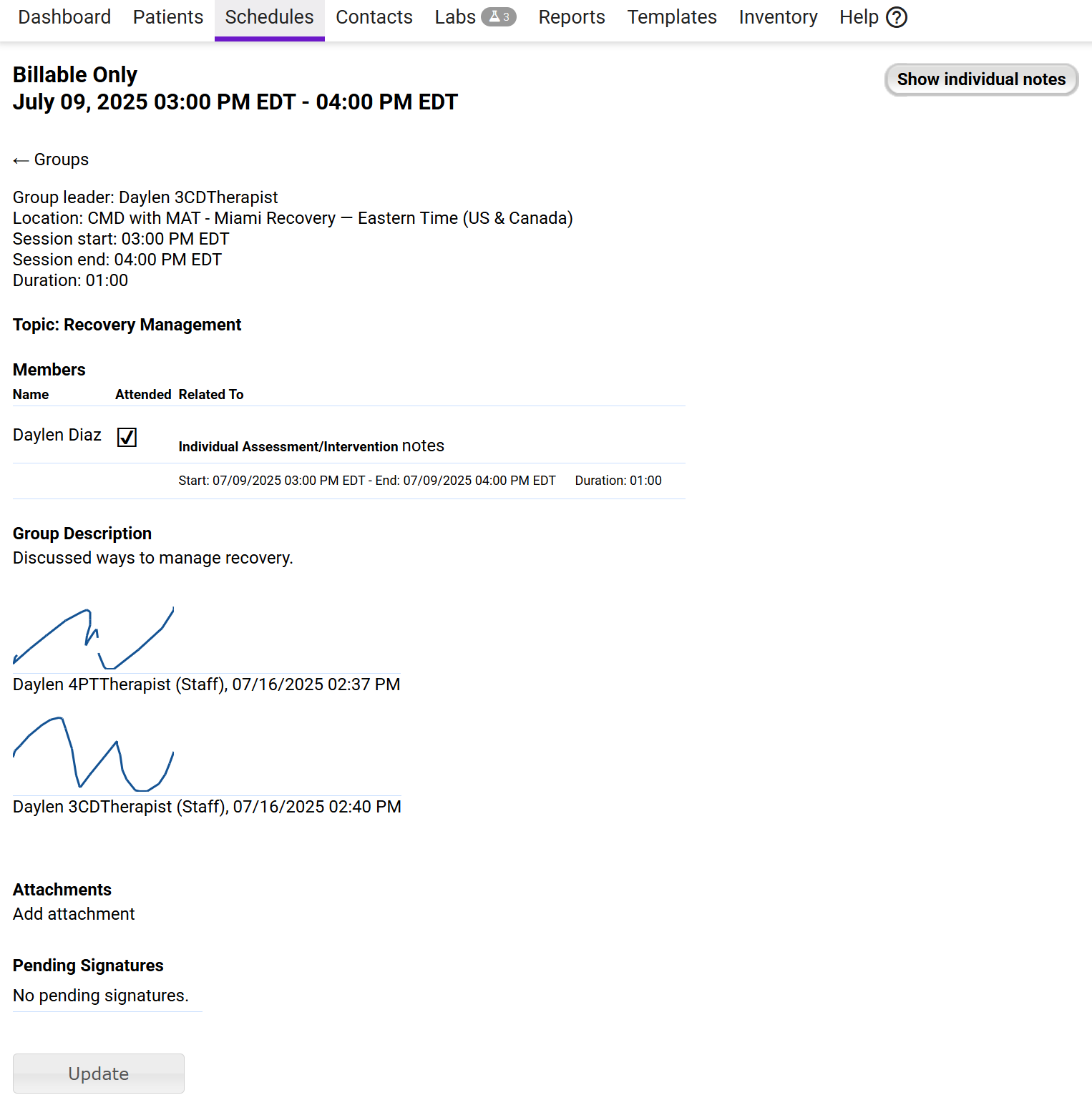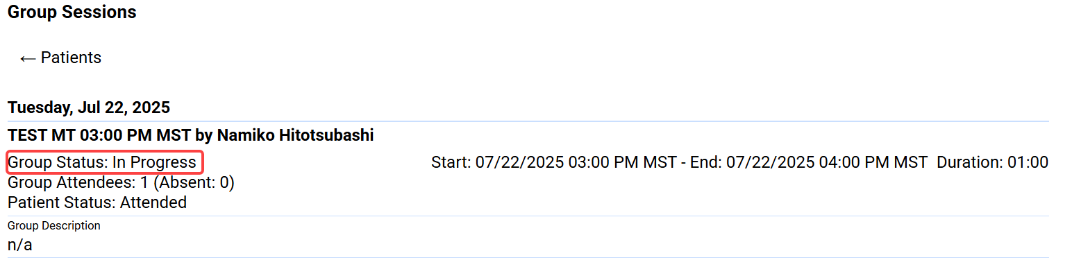 - Group sessions with the In Progress or Pending Review statuses will appear in the patient’s chart in the Group Session tab. We have also updated the notes layout in this view. For more information on the Group Session tab, check out this article.
