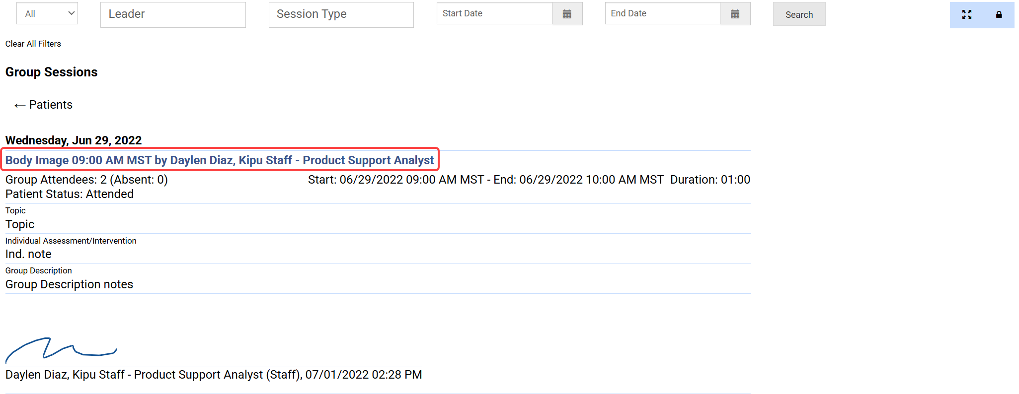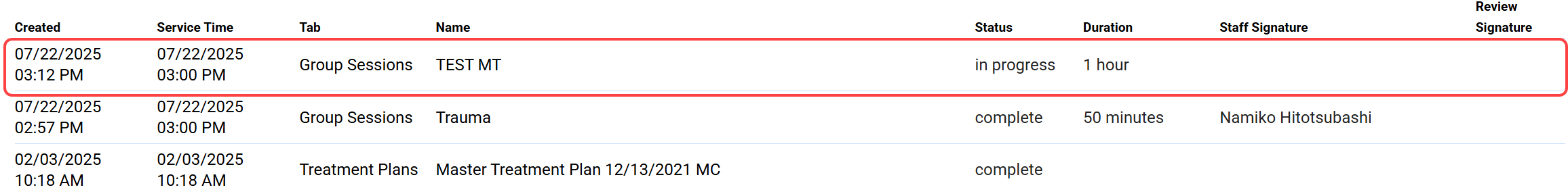 - Group sessions in the In Progress or Pending Review statuses will appear in the patient’s chart under the Chart Summary tab. Check out this article for more information on the Chart Summary tab.