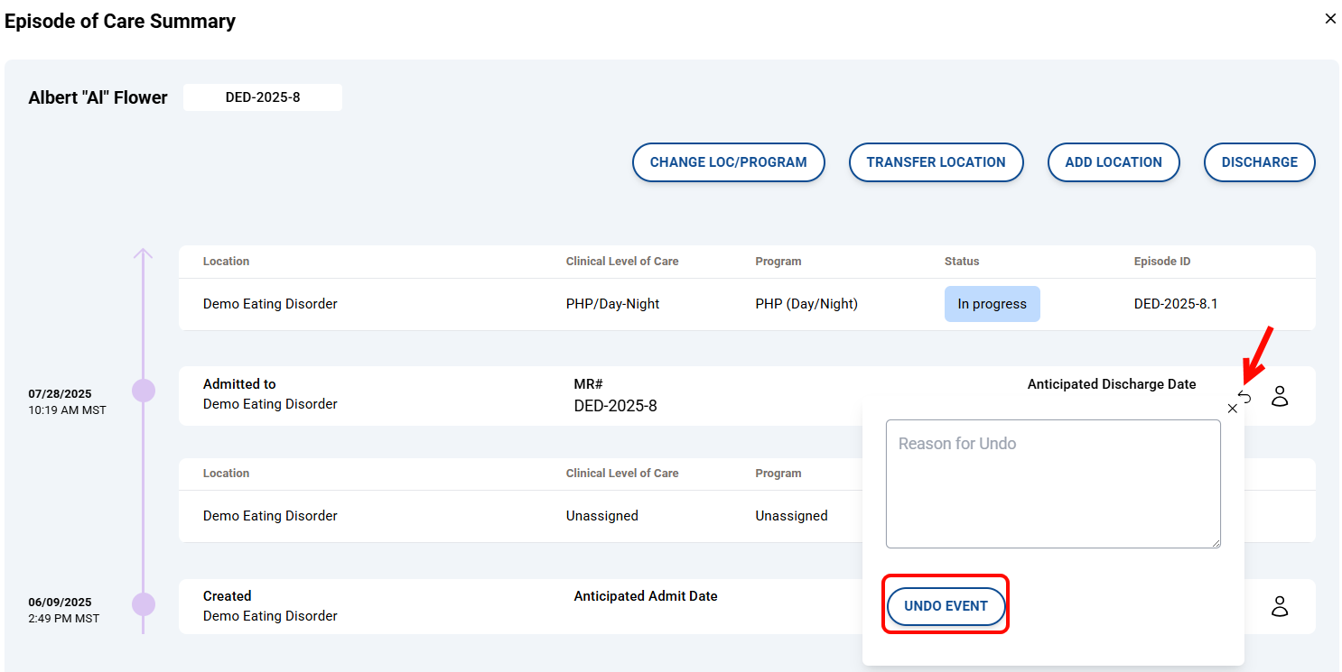 - Yes, as long as the events do not have documentation attached. Once documentation has been added to the treatment episode, the Undo option becomes unavailable. Click here to learn more about the undo functionality.