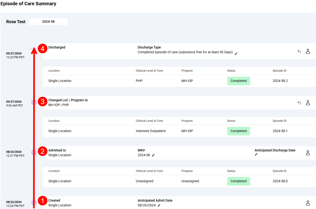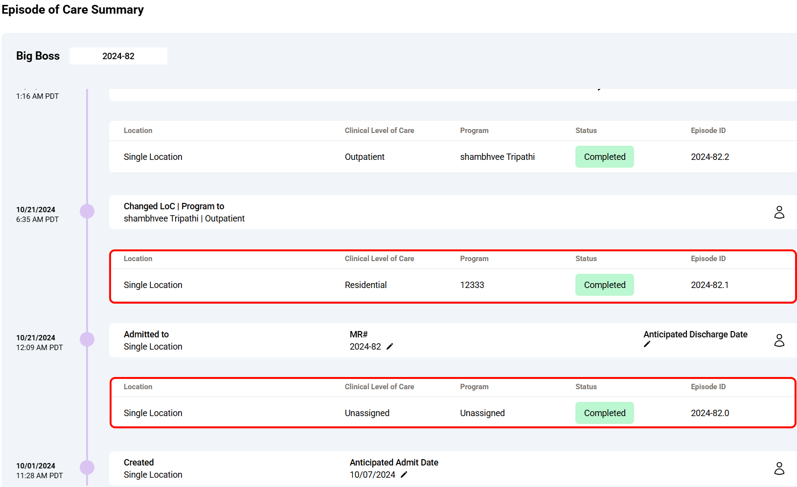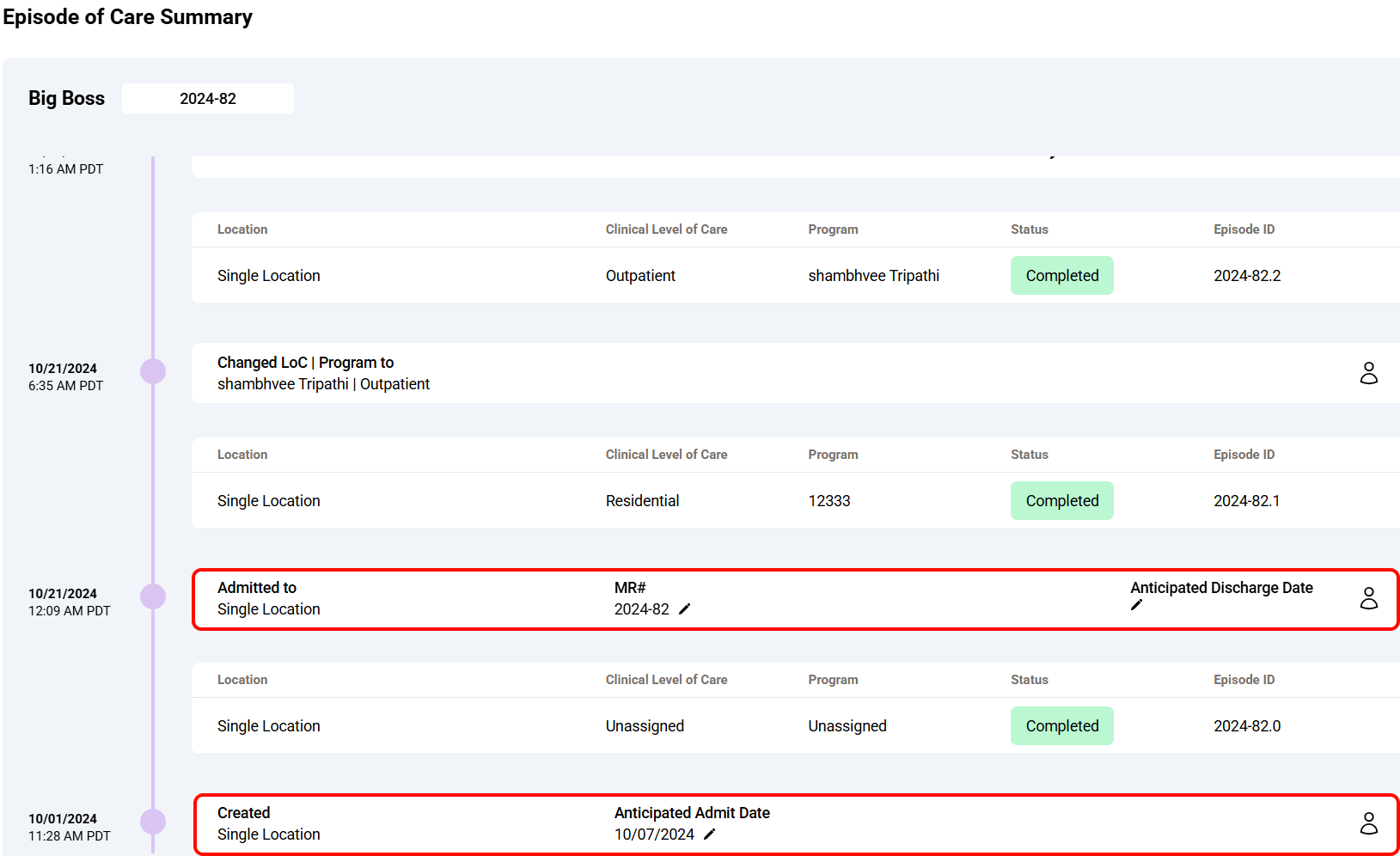 - An Episode of Care Summary spans the full treatment timeline from pre-admission to discharge. Treatment Episodes are segments within that timeline based on changes to location, LOC, or program.