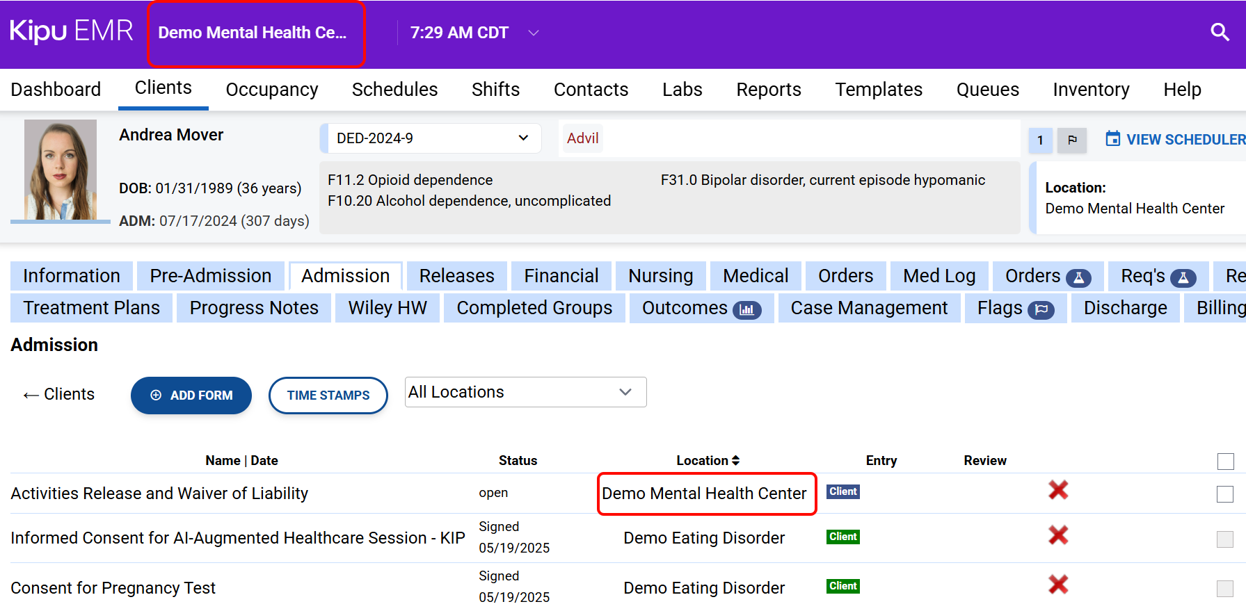 - All documents are grouped by Treatment Episode. Users can view documents from other locations, but cannot edit them unless they have access to that location. Click here to learn more about the Transfer Location workflow.