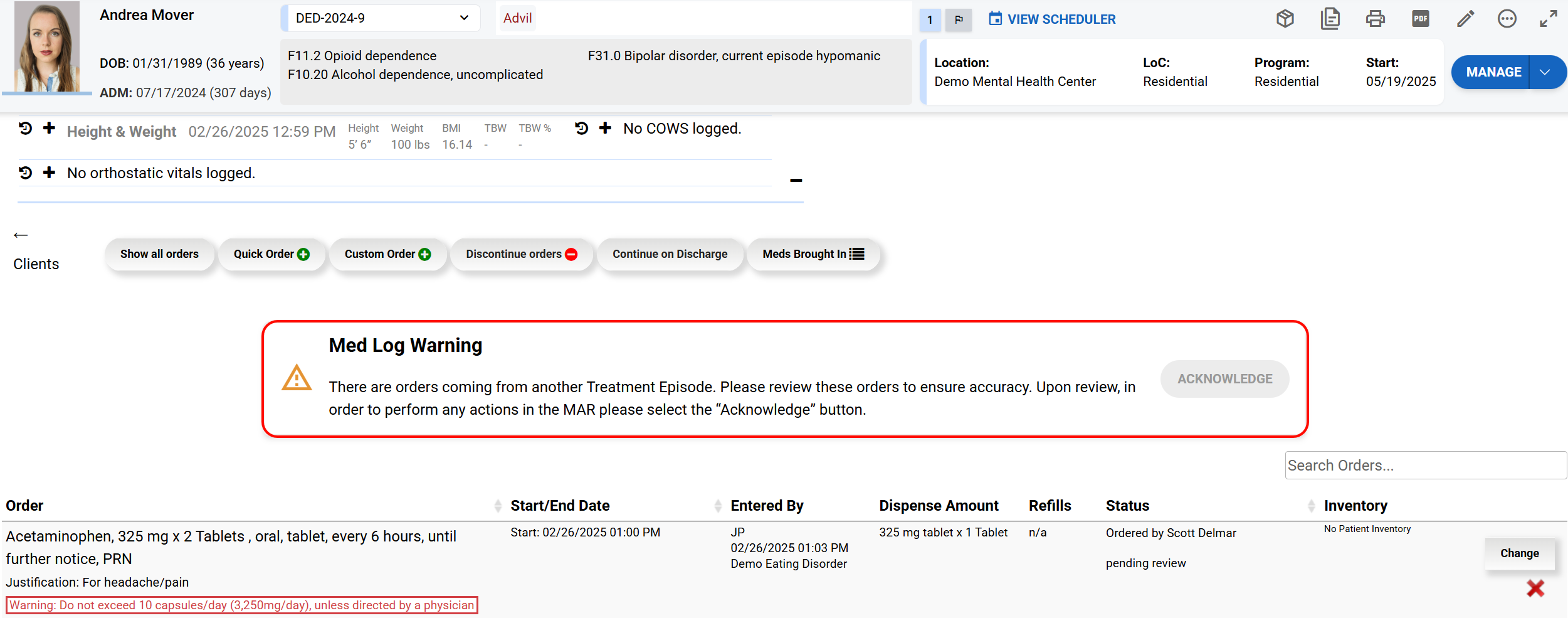 - Doctor’s orders transfer automatically. The user must click Acknowledge before the medication can be administered in the MAR/Med Log. Click here to learn more about the Transfer Location workflow.