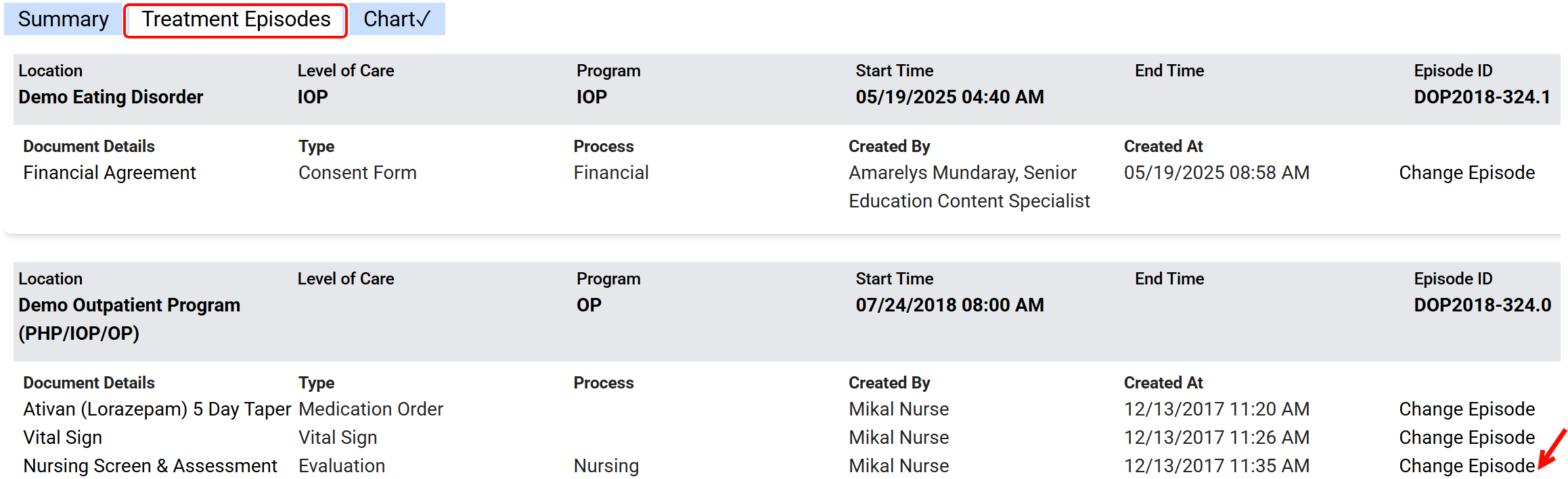 - Yes. If a form is linked to the wrong Treatment Episode, it can be reassigned. Go to the Chart Summary tab, open the Treatment Episodes section, and click the Change Episode button next to the document, doctor’s order, or group session that needs updating. Click here to learn how to move documents.