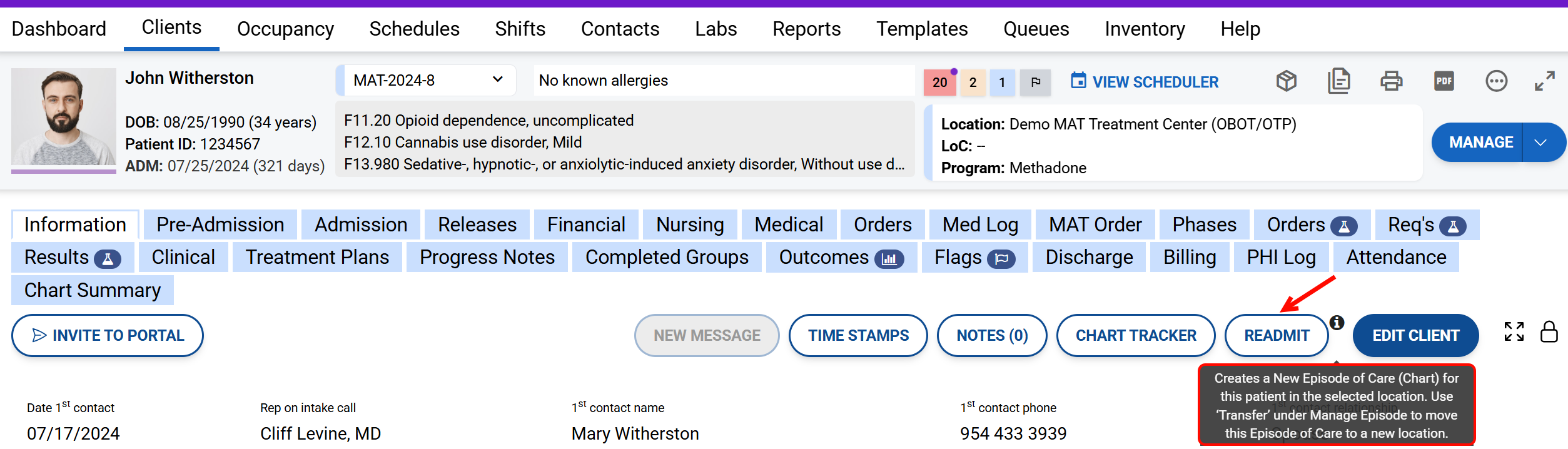 - The Readmit button creates a new patient chart—either in the same location or a different one, depending on your access. Kipu automatically copies key information like demographics, payment details, contacts, allergies, and dietary needs into the new patient's chart. Learn more about how to readmit a patient.