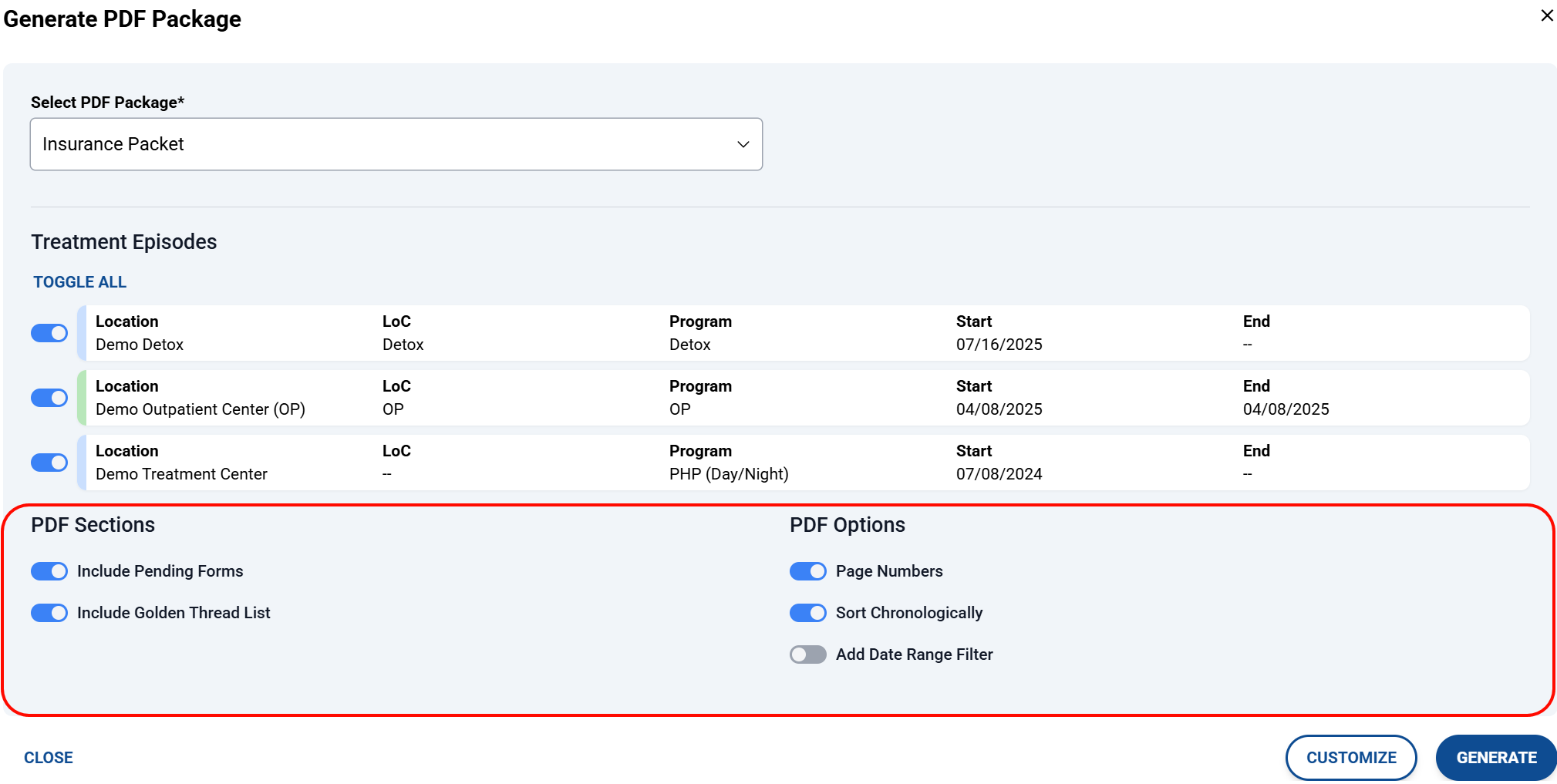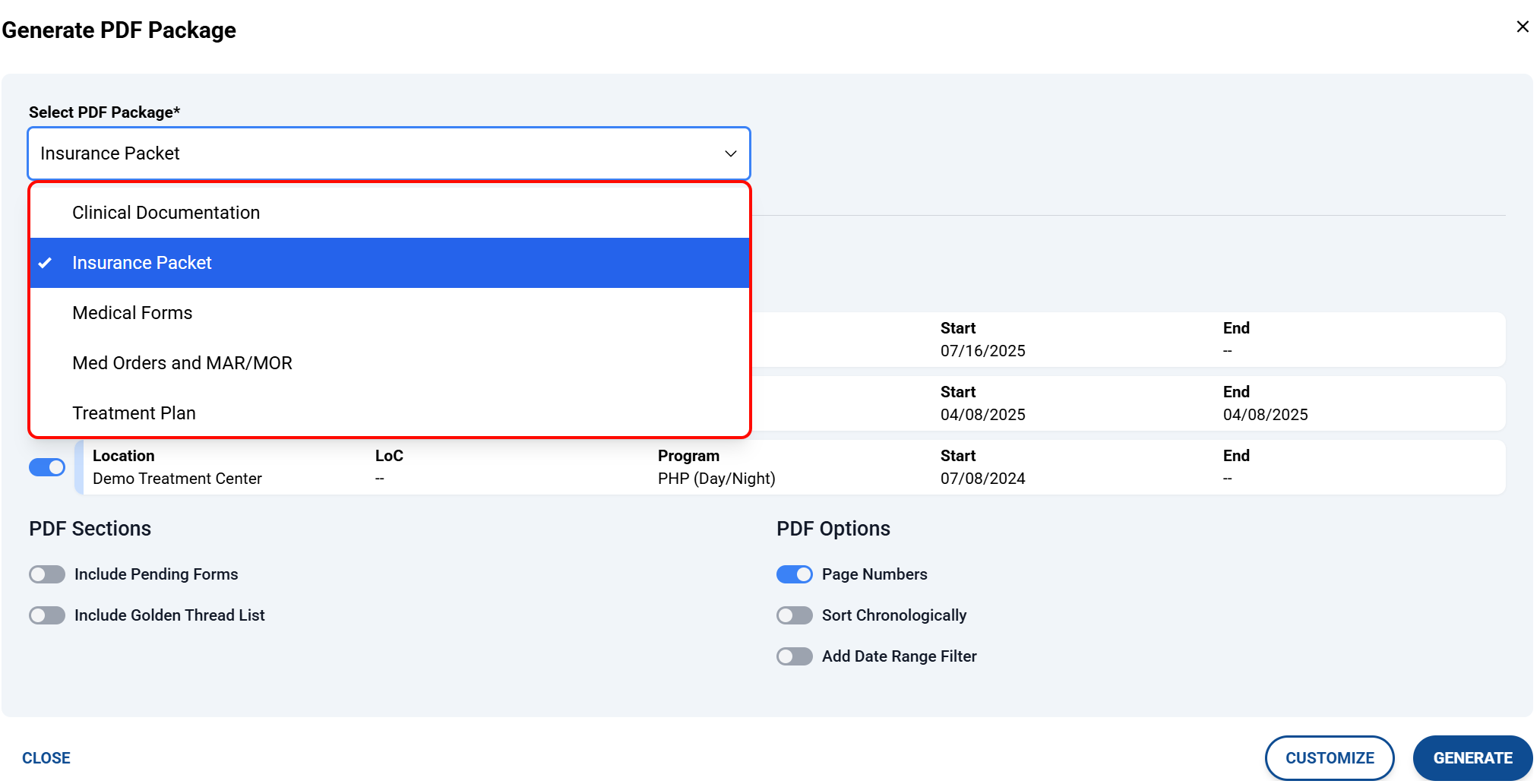Users can now generate PDF packages for specific treatment episodes, allowing documentation to be pulled from a specific portion of an episode of care. This feature is especially helpful when sharing records with third parties who need documentation tied to a particular treatment phase.
