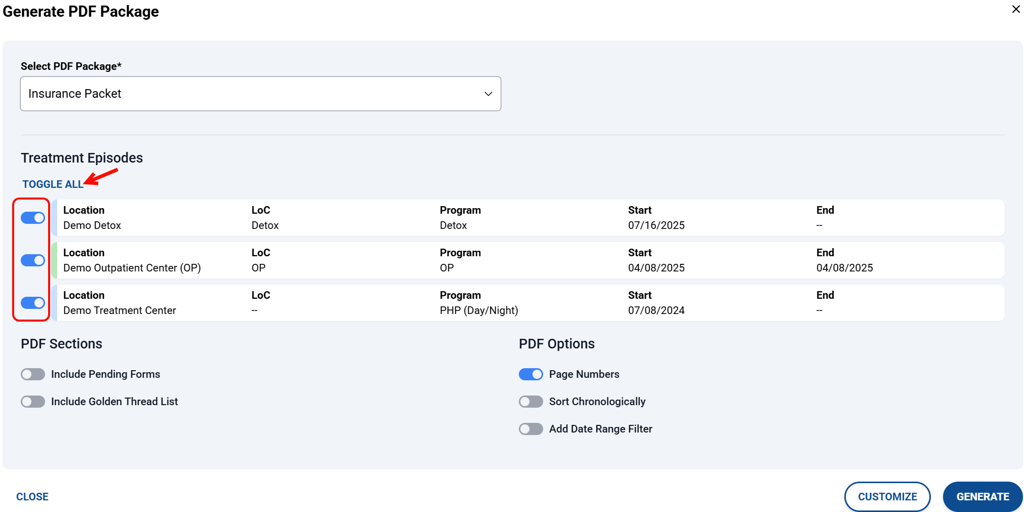- You can customize the items in PDF Sections and PDF Options by setting the toggles to on for the documents you want to include from the selected treatment episodes.