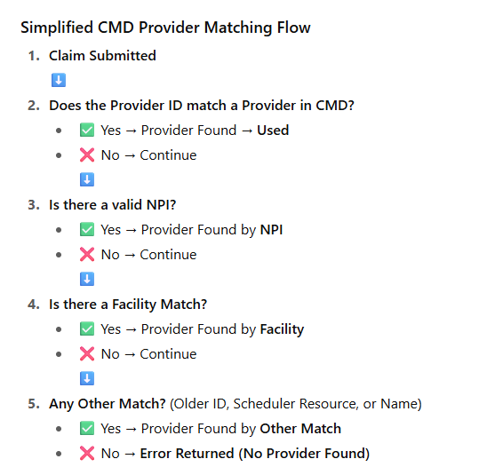 If CMD can’t find a provider by facility reference, it will try a few other steps to find the best match: