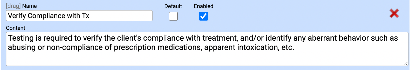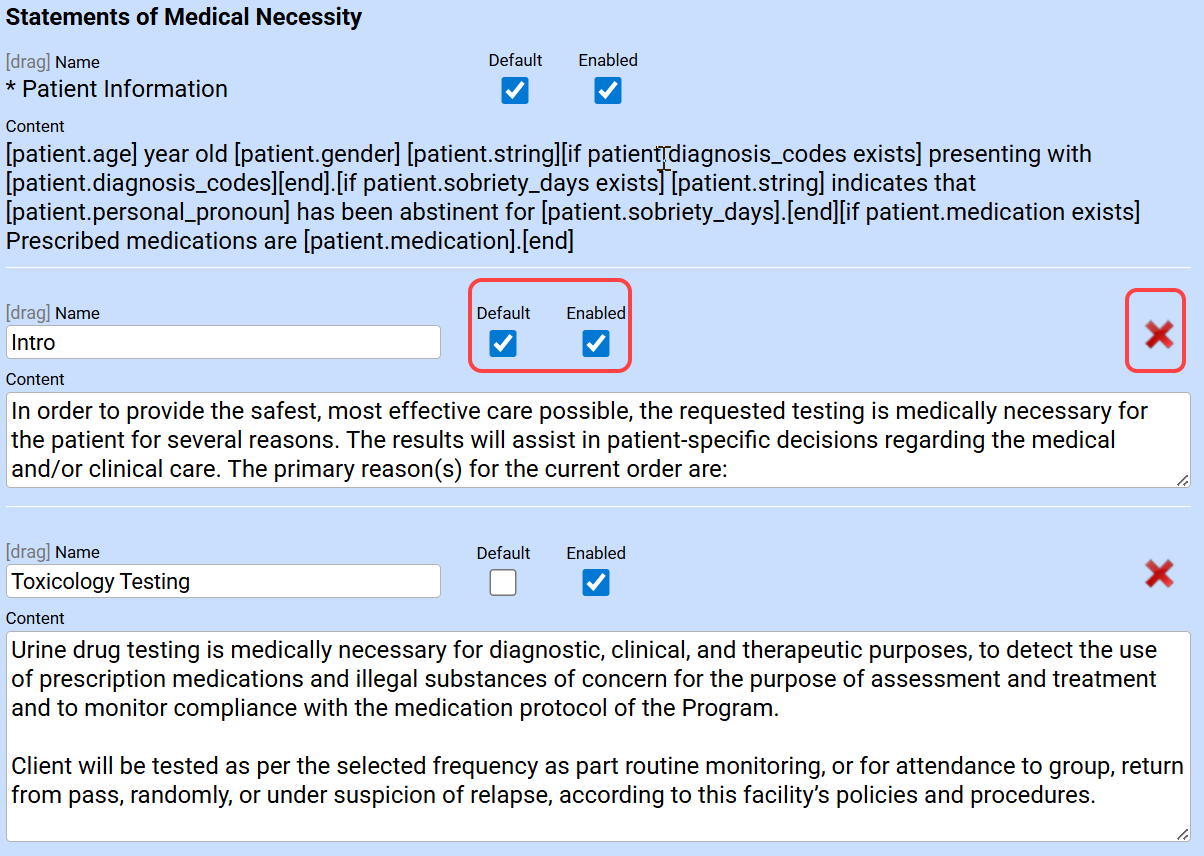 To set up orders, you must first configure your Statement of Medical Necessity, Lab Frequencies, and Durations. Facilities can customize the rationale for toxicology and/or clinical lab orders. Standard statements can be created in the Orders Settings tab and can be further customized at the time the order is created.
