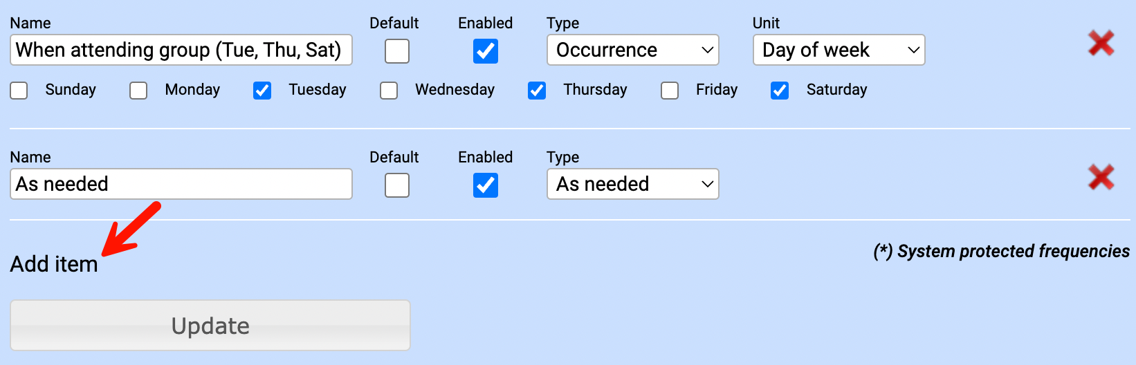 - To create a new order frequency, click Add Item.
