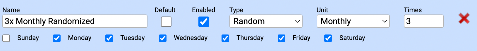 - Random: Testing occurs a specific number of times per week or month, but days are selected at random based on your configuration (e.g., 3 times a month on randomized days).