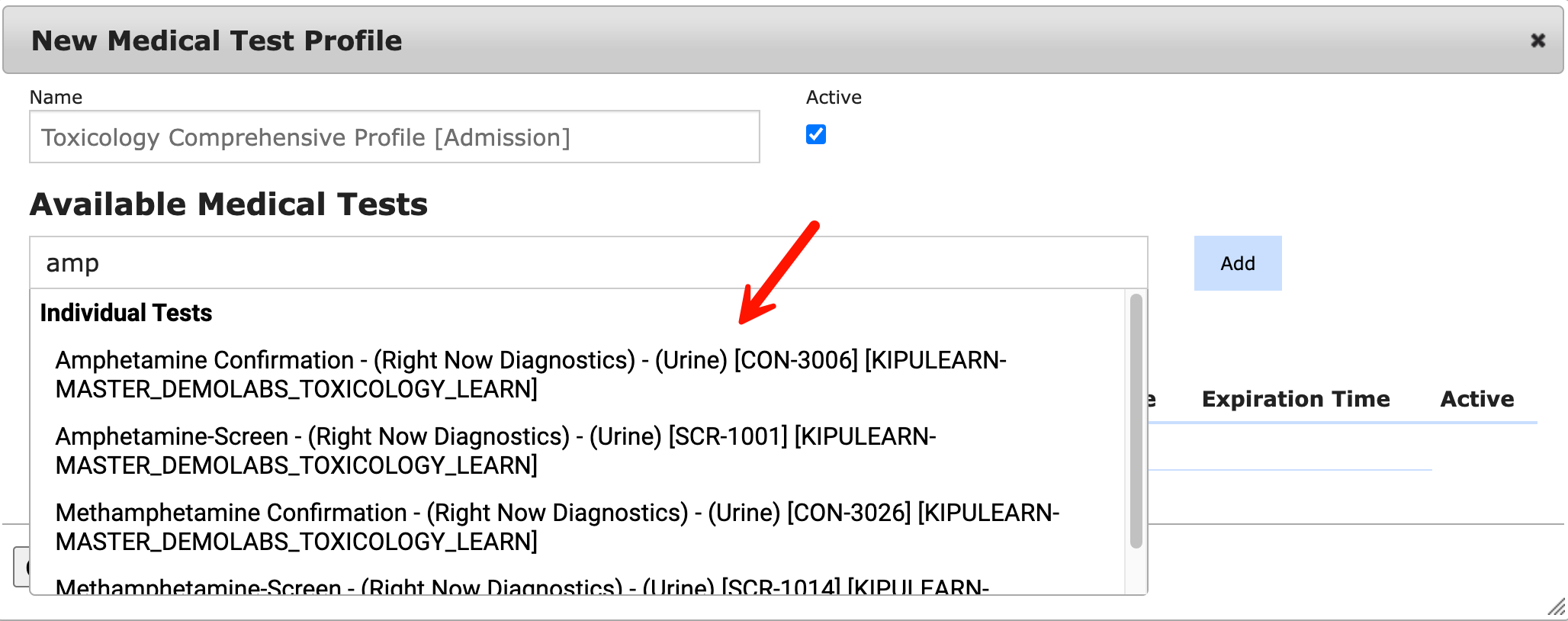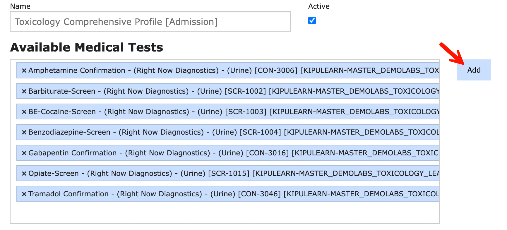 - Use the Available Medical Tests field to search for lab tests to include. Simply start typing the name and select the test from the drop-down.