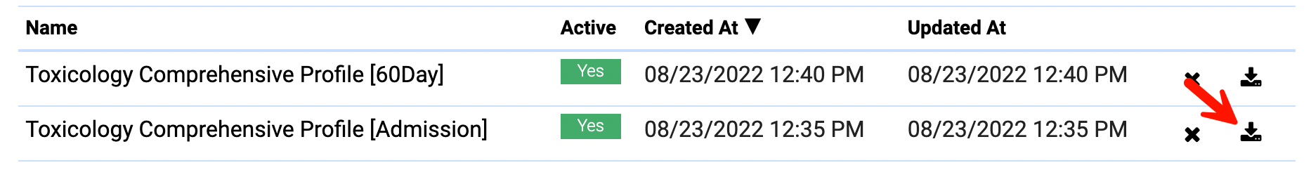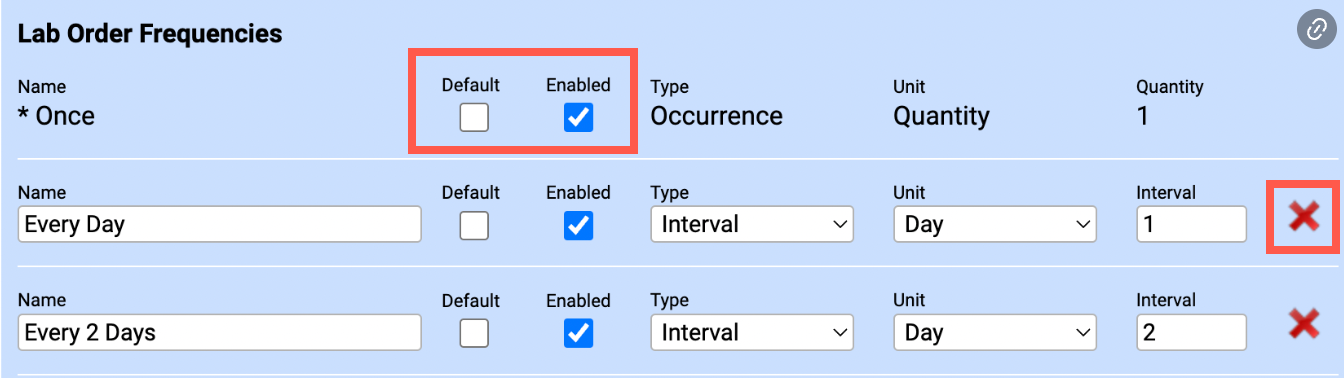 - Delete: Click the x button to remove the frequency from the system. Not recommended! Please disable frequencies that have already been used for lab orders.