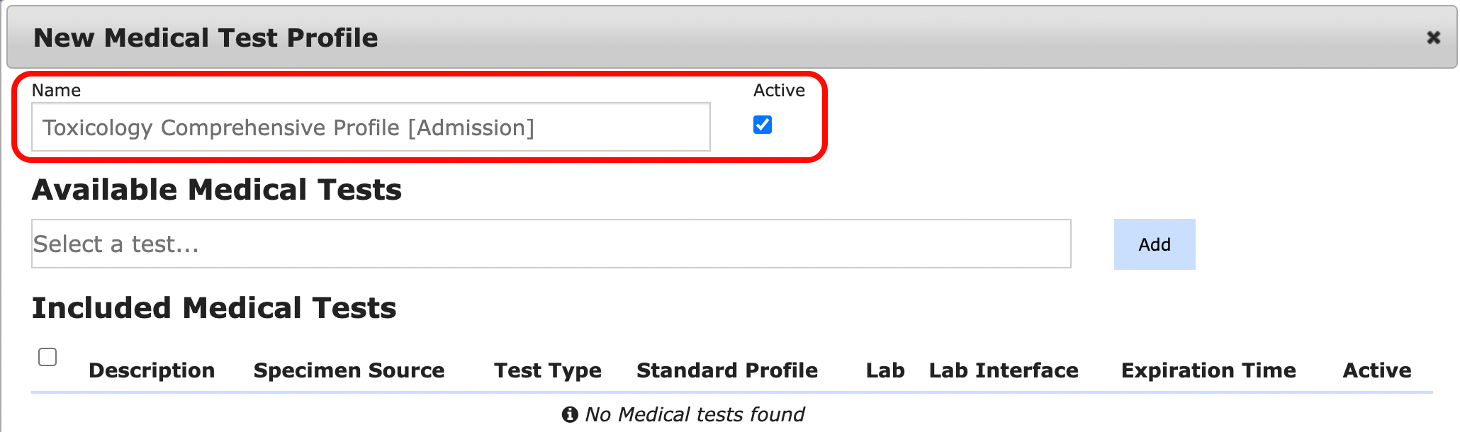 - The new profile opens, allowing you to update the name and included medical tests.