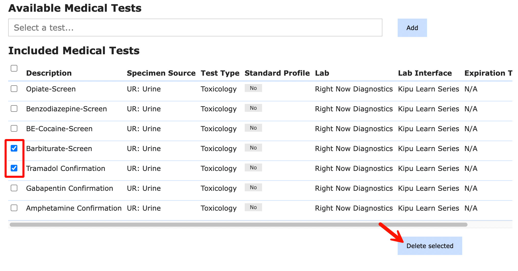 - To delete a test from this profile, check the related box and click Delete selected.