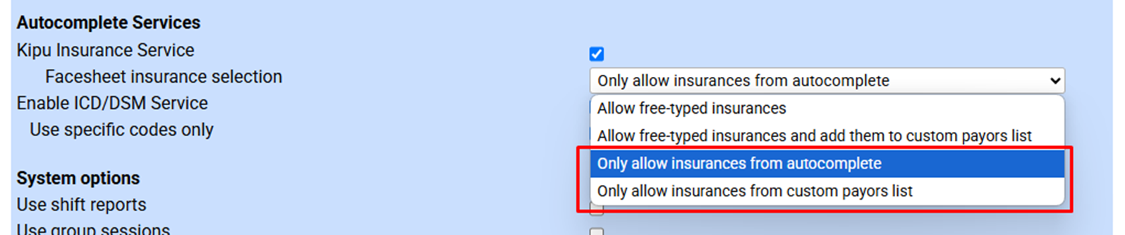 From Settings > Instance, scroll down to (or search for) Autocomplete Services and set the Facesheet Insurance Selection feature to Only allow Insurances from autocomplete or Only allow insurances from custom payors list. Make sure to scroll down and click Update to save.