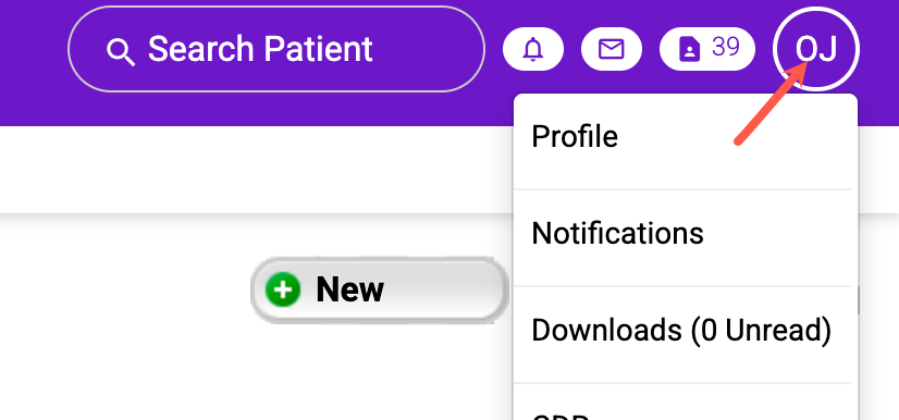 To get to the Settings, start by clicking on your initials in the upper right-hand corner.